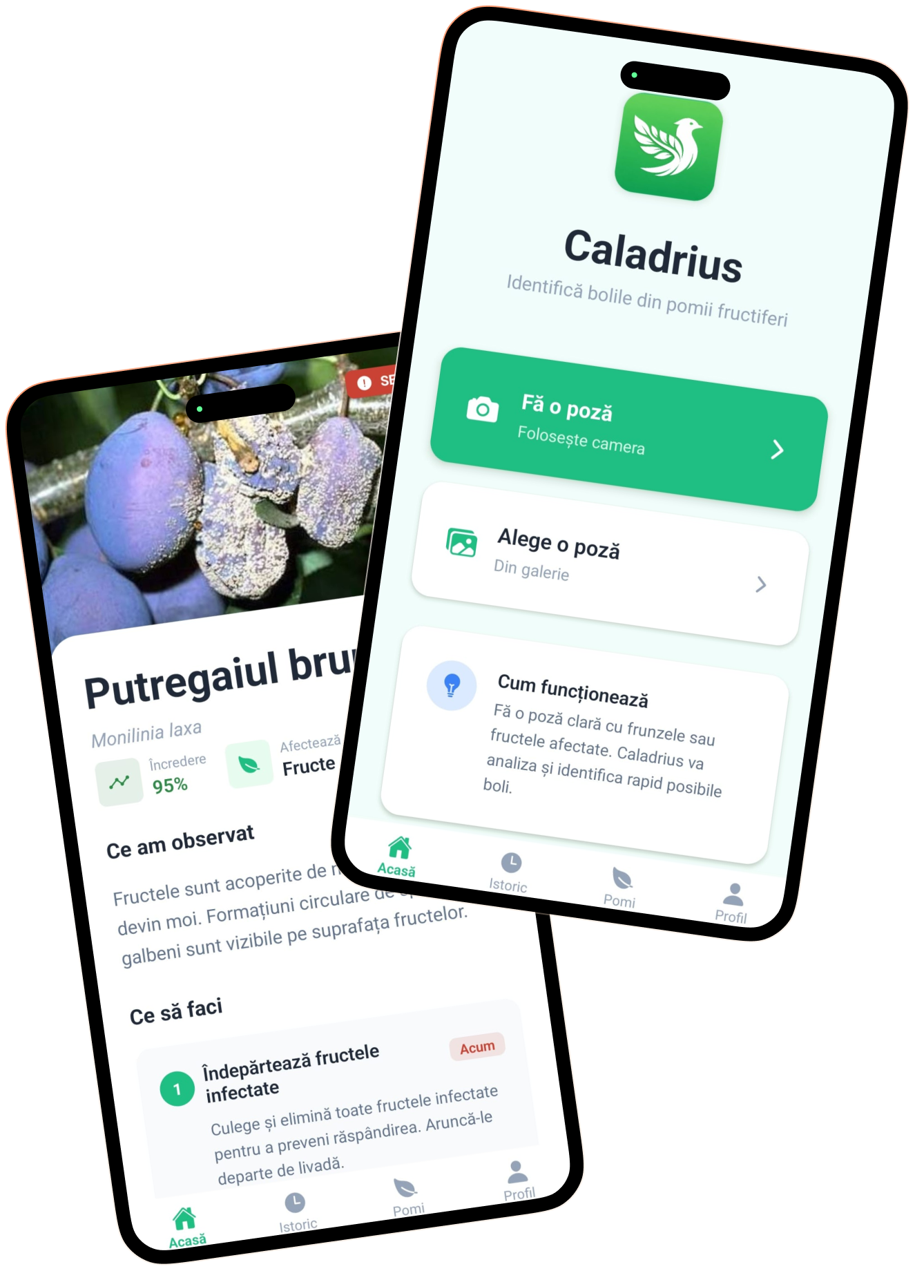 Caladrius analizează imaginile pomilor tăi și identifică rapid bolile, oferindu-ți soluții clare și rapide.